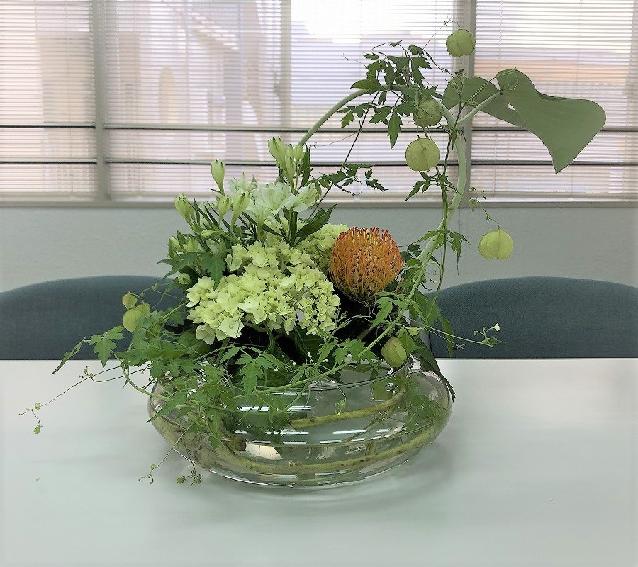 日々、暑さが厳しくなっていく今日この頃、皆様、いかがお過ごしでしょうか。 台風が徐々に増えてきて、沖縄にも影響がでてきました(~_~;) 去年みたいな災害がないことを祈ります さて、今回のお花です! 花もそうですが、入れ物も夏らしく、涼しげのあります! ぜひ、見てみてください!!