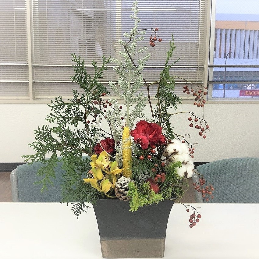 どんどん寒さが増してきたと思っていたのに、急に熱くなってきた今日この頃、皆様いかがお過ごしでしょうか? 先週の金曜日ごろから雨が降ってきてかなりひんやりしてきたので、 もう寒くなるのかな?と思っていたら、今日から又、暑くなっていくみたいです(~_~;) よくわからない冬ですね(;^ω^) さて、今回のお花です! 今回はクリスマスをイメージしたお花です! 雪が積もった松ぼっくりや、よく見るとある、リンゴなど、ぜひ、見てみてください!!