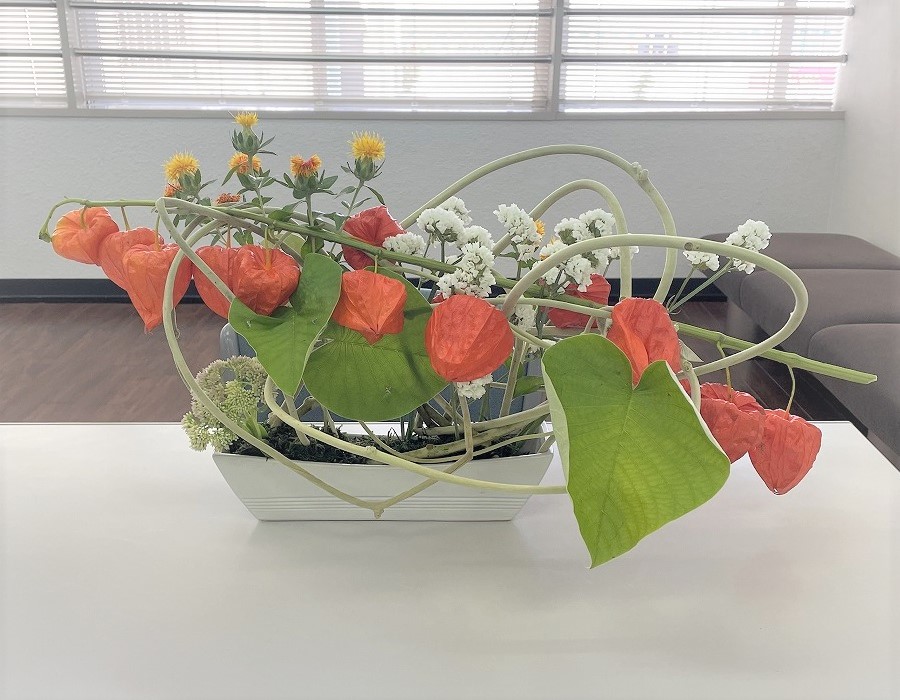 暑さがどんどんひどくなっている今日この頃、皆様いかがお過ごしでしょうか。 暑いです。そして、急な土砂降り・・・( ;∀;) 沖縄の夏ですね~(;^ω^) 緊急事態宣言も再び延長(-_-;) 大型店舗も土日祝日は休みになりました(-_-;) 早く、落ち着いてほしいです。 さて、今回のお花です! 鬼灯があって風流です! ぜひ見てください!!